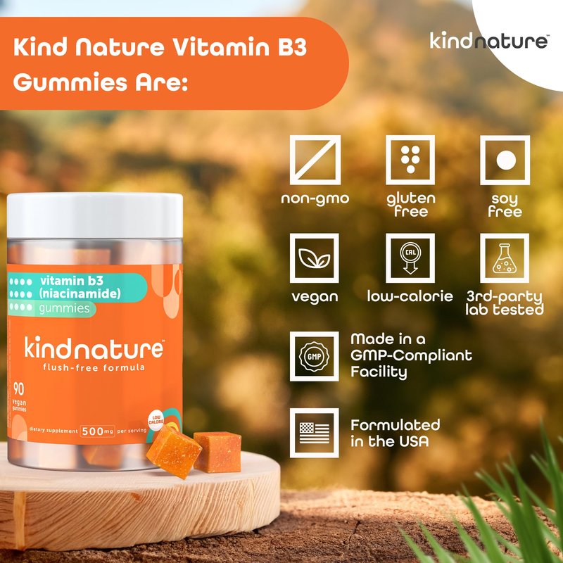Kind Nature Vitamin B3 Niacin Gummies - Flush Free Niacinamide 500mg Supplement - Vegan, Non-GMO, Low-Calorie, Gluten-Free, Soy-Fee, 3rd Party Lab Tested - 1 Month Supply, 90 Chewable Gummies