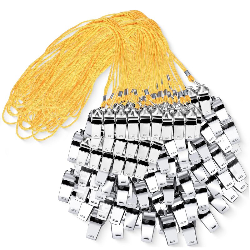 Features: Thoughtful gifts: The gym whistle with lanyard is feasible to be shared with your friend, colleagues, classmates, family members and teachers, making them feel your sincere care. Loud sound: Our metal whistles with lanyard can produce a loud and clear sound, giving you a better using experience, ideal items for matches or games. Specifications: Material: stainless steel Color: silver, yellow Size: Whistles: about 1.8 x 0.6 inches The lanyard: about 17.72 inches/ 45 cm Package includes: 100 Pieces of whistles with lanyard Notes: Manual measurement, please allow slight errors on size. The color may exist a slight difference due to different screen displays.