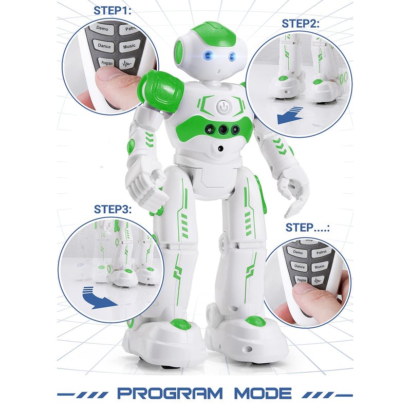 - 🍀Intelligent Programming : This smart robot toy can demonstrating a set of 50 actions inputted by the user.If you switch programming function,this Interactive robot will playback using its moves record feature to repeat the movement one by one as you created like turn left+turn right+walk forward+walk backward+patrol+dance+and many others action mode you selected.
