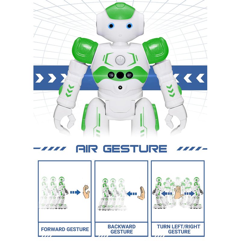 - 🍀Remote Control and Hand Gesture Control : This gesture sensing robot not only can be controlled by infrared controller, but also can turn left ,turn right, slide backward, and slide forward according to how your hand gesture commands. Multi function includes auto display and obstacles avoidance as well. The toy robot’s eyes light up with bright blue illuminating LED when it moves.