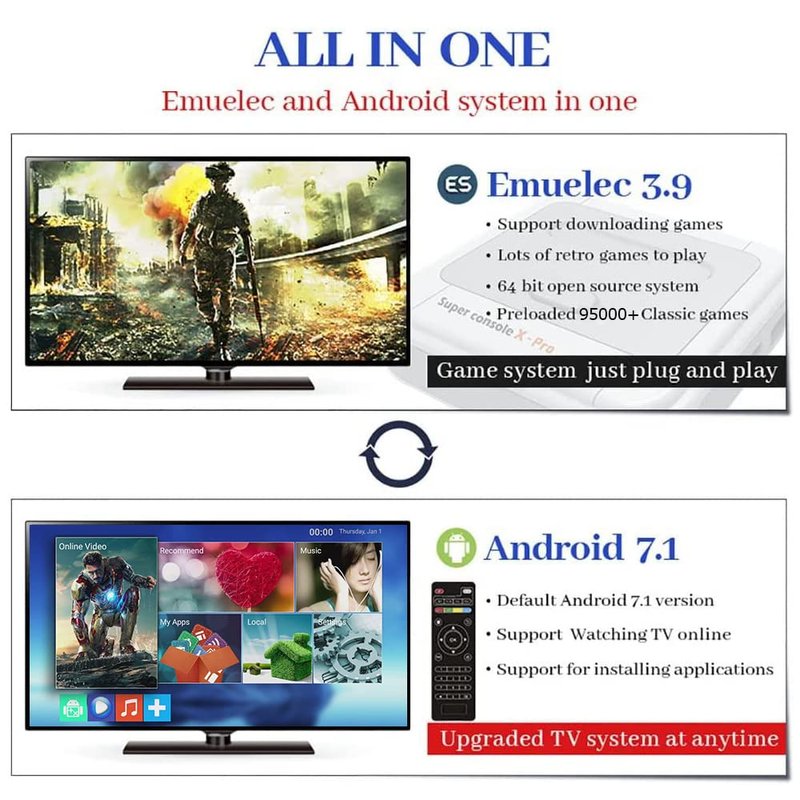 - 🎮RICH CLASSIC GAMES - More than 55,000+ classic games are pre-installed in super console x pro to relive your good memories. TF card expansion is supported to add more games.(🌟Tip: If some games are not working, you can change the emulator to play.)
