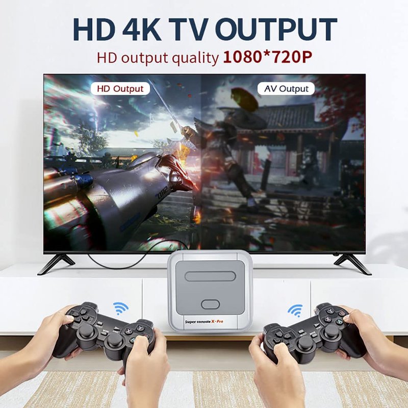 - 🎮ENJOY 4K GAMING EXPERIENCE - Supporting 26 Languages and HD/AV(1080P/720P) output,super console x pro is easy to set up,simply plug and play,and you can enjoy retro gaming fun on your 4K TV.With WIFI/LAN connection,you can also watch TV online.