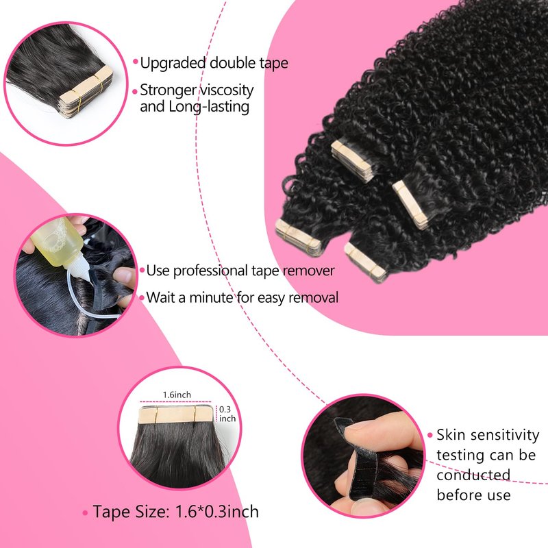 - [Excellent Color Match & Versatility in Style] Our Tape in Human Hair Extensions are designed to match your hair color perfectly, with a healthy and natural shine. Jerry Curly and Kinky Curly are available, You can do as you like be dyed, strengthened, curled. It's better to do this by professionals, please keep the temperature below 350 Fahrenheit.