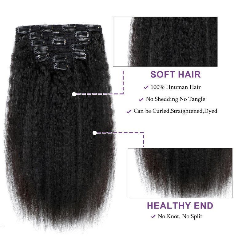 - Secure U-Shaped Steel Clips:Kinky Straight Hair Extensions Clip in Human Hair, The Silicone Lined Has a Certain Friction to Keep The Hair Extensions in Place and Harmless to Your Own Natural Hair, Multiple Thread Sewed at 5 Parts to Make The Clips Stay Stably Even After Frequent Use (After Hundreds of Real Try-On Tests)