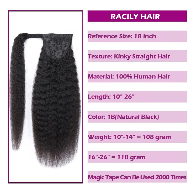 Kinky Straight Ponytail Human Hair with Wrap Around Magic Tape, Brazilian Hair Clip in Extensions Wavy Yaki Pony Tail Color Natrual Black (14", 1B, Kinky Straight, Wrap Around)