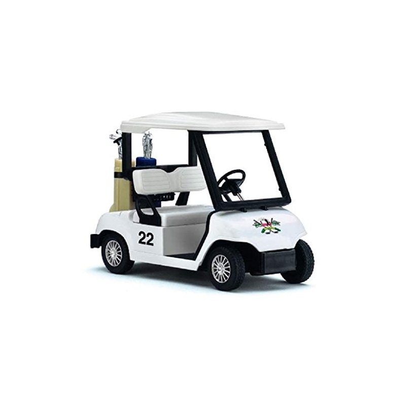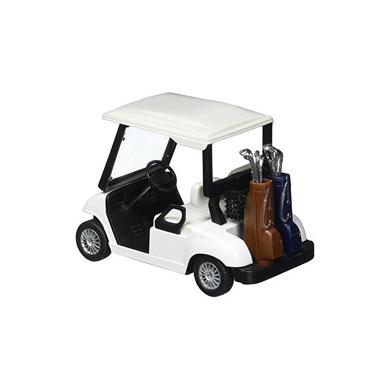 Kinsmart Golf Cart. This golf cart is 4.5Lx 2.25W x 3.25H diecast metal with plastic parts, pullback motor action. Come in White.