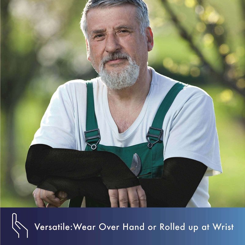 - LATEX-FREE: Skin Protector Arm Sleeves for Men and Women feature Wide Comfort Bands at the bicep and around the hand to keep the arm sleeve in place during work or leisure activities. Engineered with Moisture Wicking breathable fabric to wick away sweat to keep you comfortable and fresh all day long.