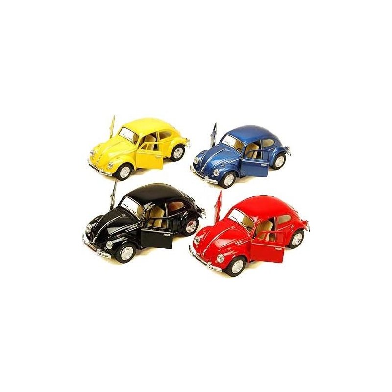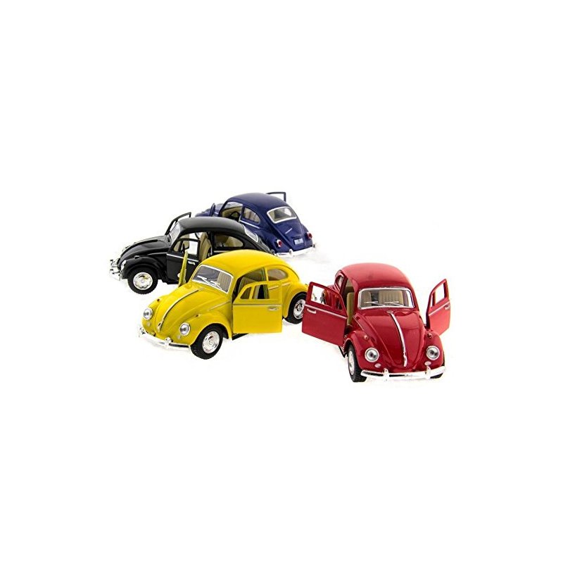 A Set of 4 pcs 5" Classic 1967 Volkswagen Beetle 1:32 Scale in Black, Blue, Red and Yellow, made by Kinsmart.