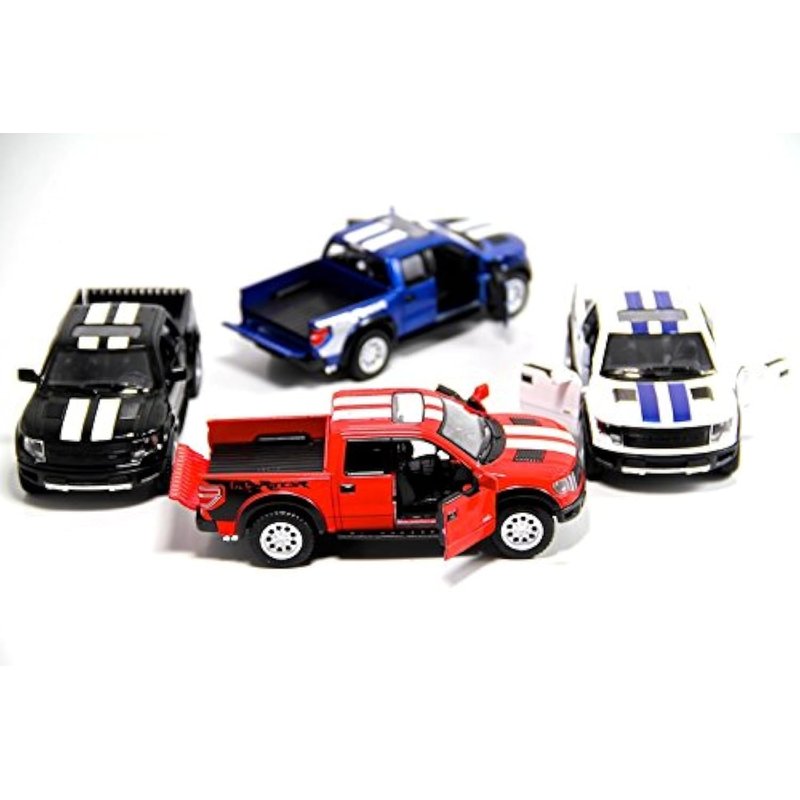 - Set of 4 Trucks: Includes 4 Ford F-150 SVT Raptor Supercrew pickup trucks in blue, red, black, and white with racing stripes.