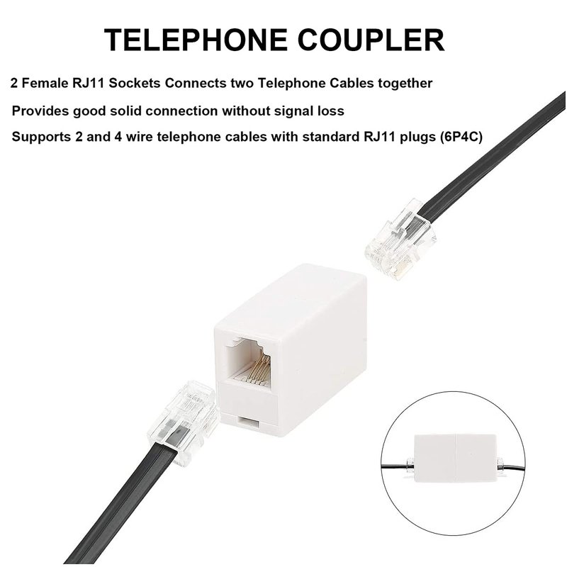 - Phone Coupler is used to connect and extend two existing telephone lines with R11 telephone head (6P4C, 6P2C crystal head) at both ends through telephone through box.