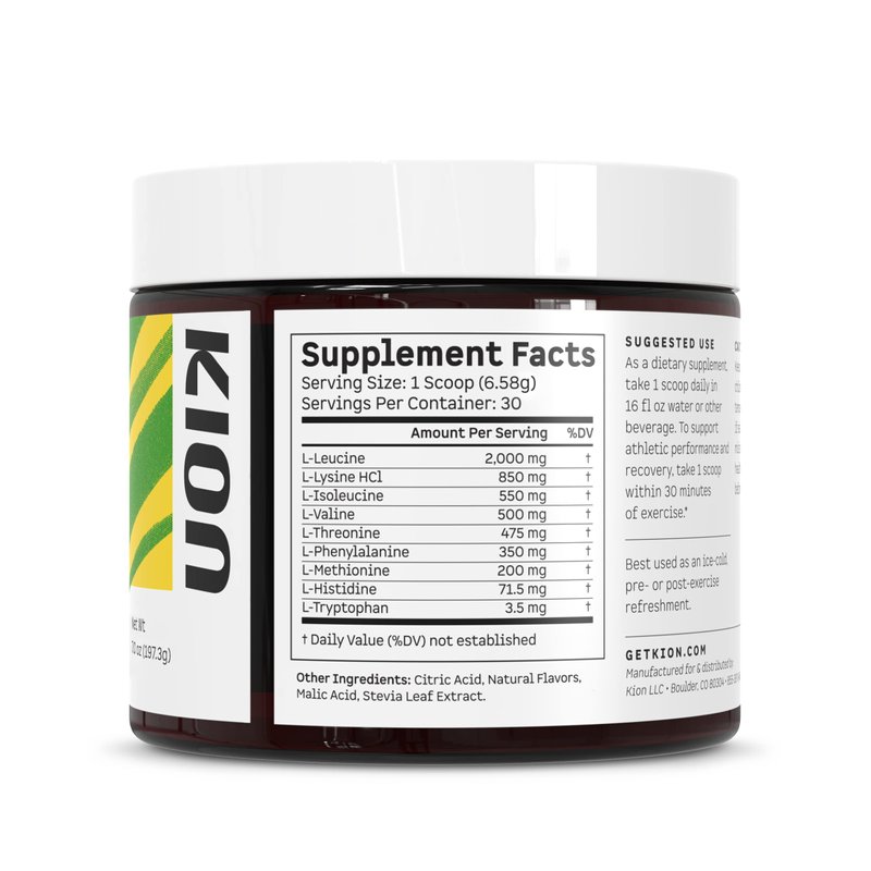 Naturally boost energy, build lean muscle, and enhance athletic recovery with Kion Aminos. Kion Aminos contain all 9 essential amino acids (EAAs): Tryptophan, Lysine, Methionine, Valine, Leucine, Isoleucine, Threonine, Histidine, & Phenylalanine. This includes the muscle-building branched-chain amino acids (BCAAs) so that you get all of their benefits without risking an amino acid imbalance. Plus, our flavors are delectable. Watermelon, Mango, Mixed Berry, and Cool Lime Kion Aminos were meticulously crafted using natural ingredients for a refreshing, fruity taste. As a dietary supplement, take 1 scoop daily in 16 fl oz water or other beverage. To support athletic performance and recovery, take 1 scoop within 30 minutes of exercise.