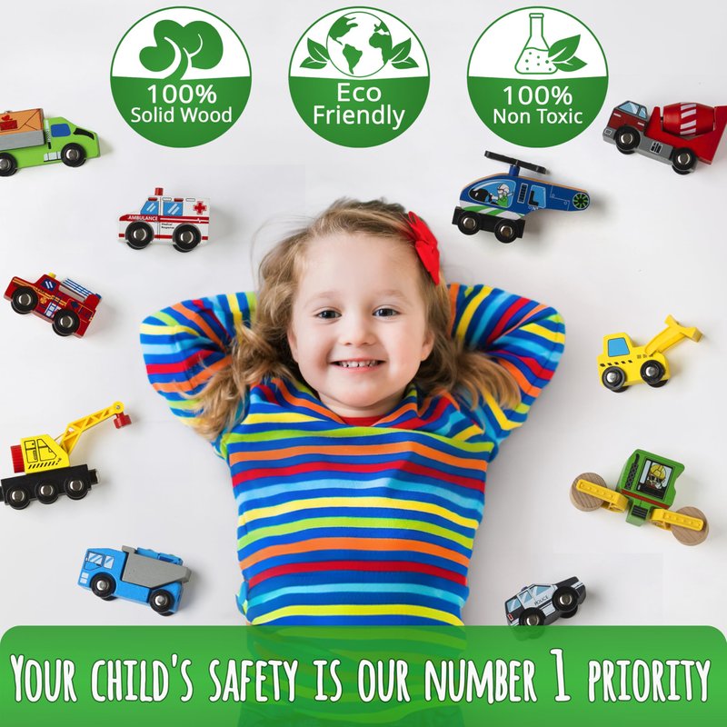 - PLAY & LEARN: Whether used as standalone toys or as wooden train track accessories, these wooden cars encourage hand-eye coordination and imaginative play. Each of the 10 vehicles is brightly colored, easy to identify, and fun for kids to grasp and maneuver. The set includes a working crane car for picking up cargo, and several vehicles with removable cargo, adding an extra layer of fun and promoting fine motor skills development