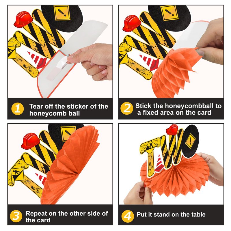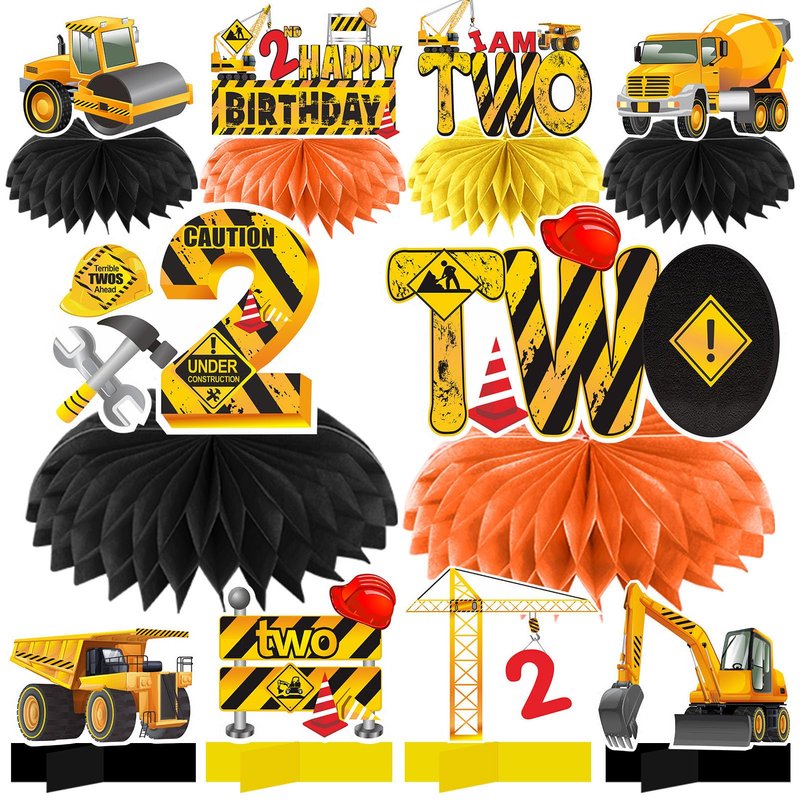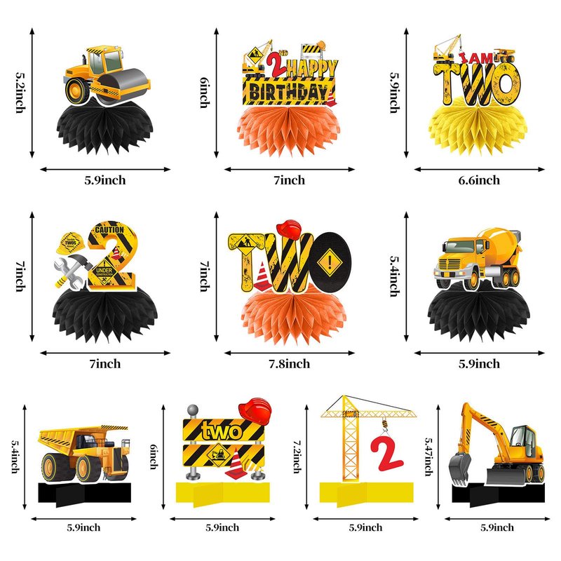 - [You will receive] -10Pcs Construction Theme 2nd Birthday Party Supplies Table Honeycomb Centers, including 6 paper honeycomb balls, 4 cross bases, and 10 Construction Theme patterned cardboard, suitable for decorating a boy's 2nd birthday party.