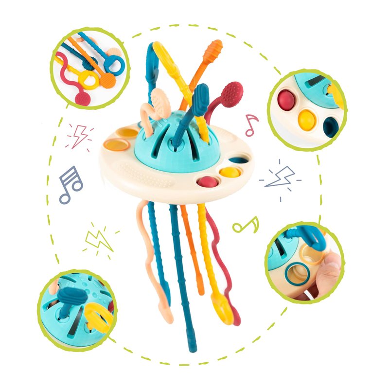 - Educational and Fun: Featuring a highly entertaining pull string feature, with movable sliders, soft press, various colors, textures, sounds, popping bubbles, this silicone pull string baby toy provides countless hours of fun and an exciting learning experience, focusing on developing essential cognitive functions from a very young age!