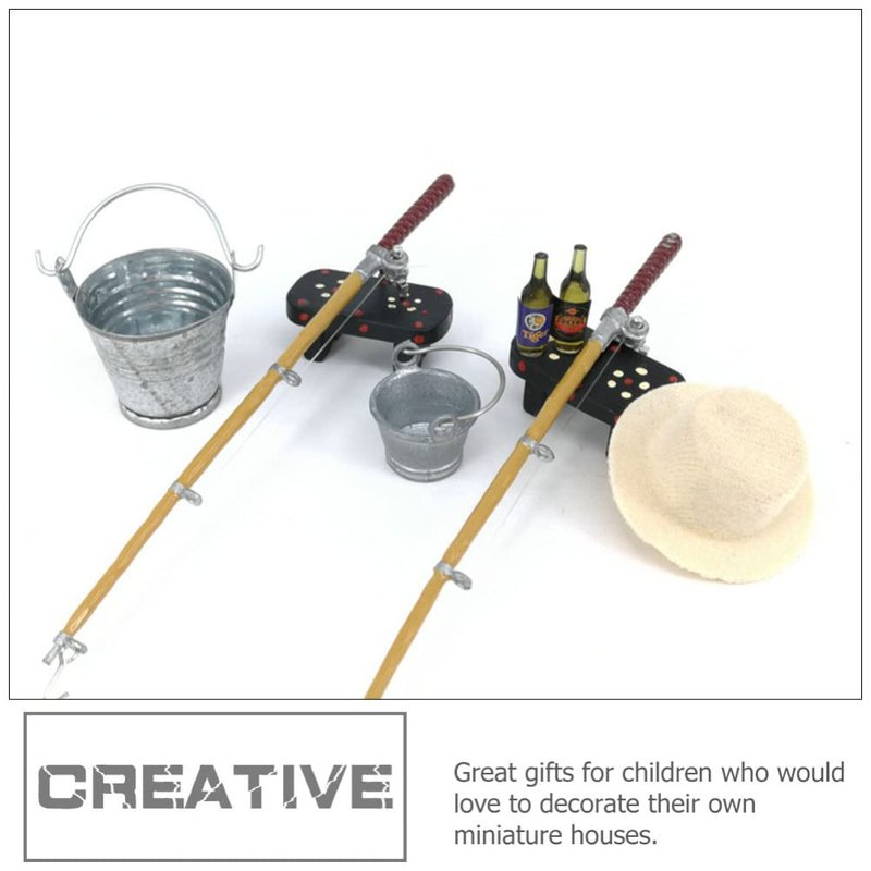 Kisangel 1Set Miniature Fishing Pole Dollhouse Fishing Rod Set Miniature Fishing Gear for Mini Bench Hat Beer Bottles Buckets House Decor