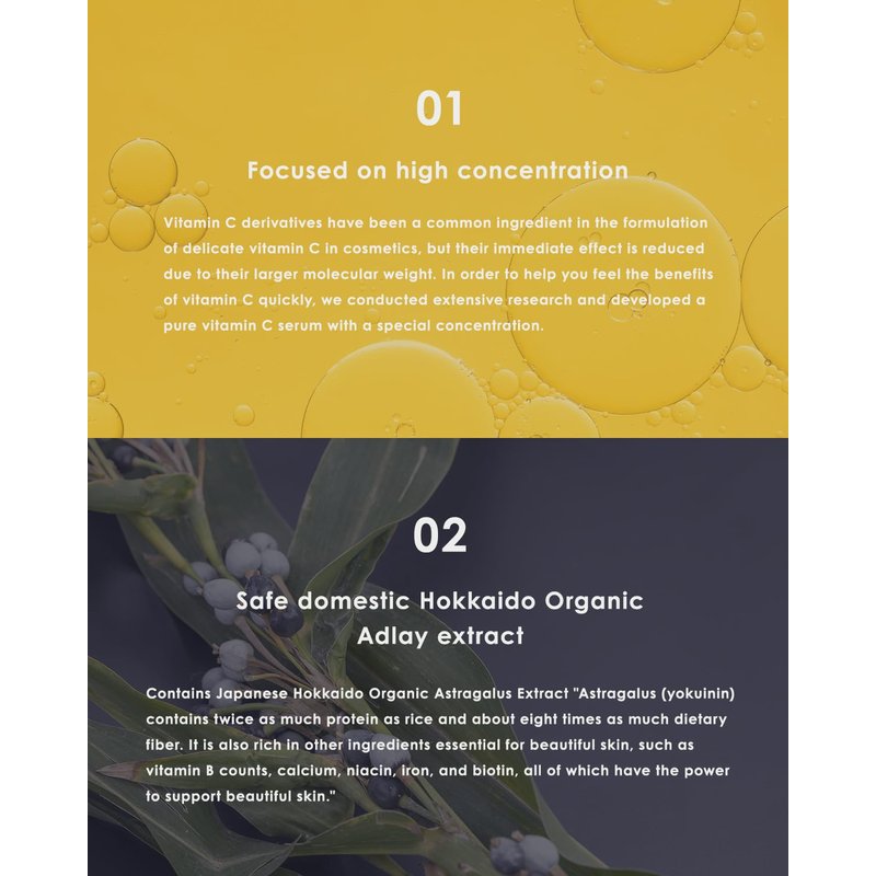 - ✅A high concentration of Pure Vitamin C Pure Vitamin C is delicate and unstable, therefore, to include it in skin care products, it has been re-formulated into more stable derivatives. However, as the molecular size of these derivatives is larger, they are not easily absorbed into the skin. In order to make the best use of the benefits of Vitamin C, KISO has formulated a concentrated Pure Vitamin C Serum that absorbs into the skin quickly, thereby increasing effectiveness.