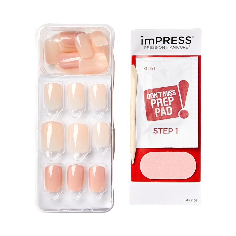 KISS imPRESS No Glue Mani Press On Nails, Bare But Better, 'Simple Pleasure', Nude, Short Size, Squoval Shape, Includes 30 Nails, Prep Pad, Instructions Sheet, 1 Manicure Stick, 1 Mini File