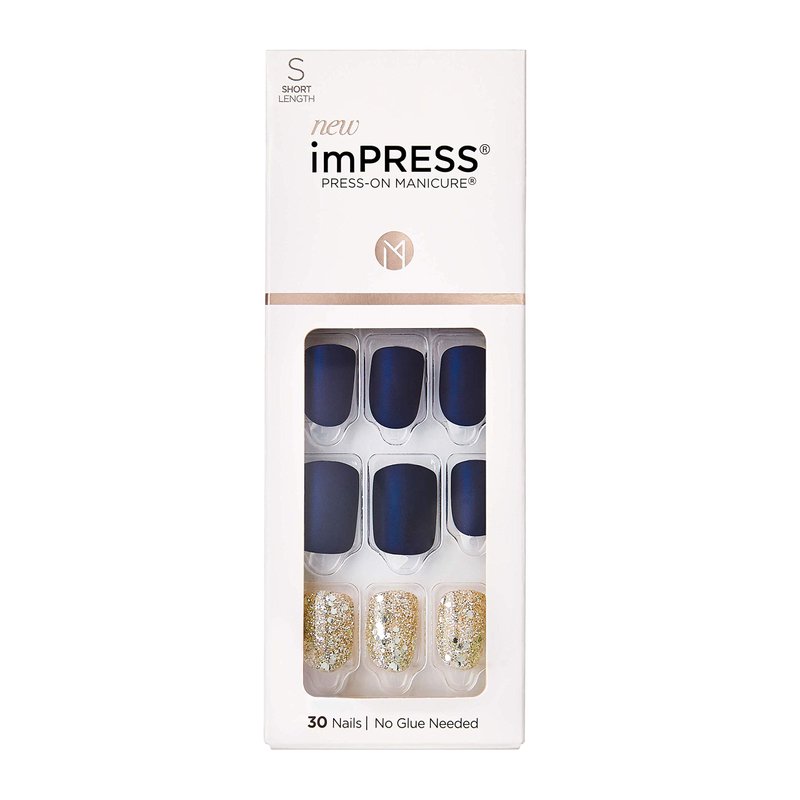 KISS imPRESS Press-On Manicure, Nail Kit, PureFit Technology, Short Press-On Nails, Wannabe Star', Includes Prep Pad, Mini Nail File, Cuticle Stick, and 30 Fake Nails Blue and Gold