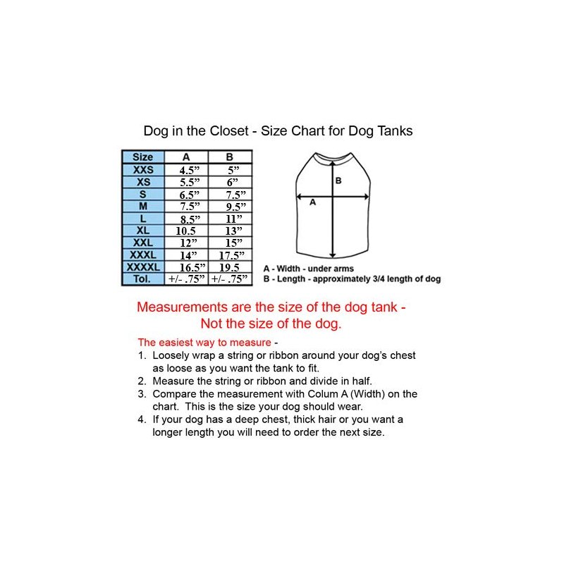 - Please use our size chart when selecting correct size. There are no standard sizes for dog clothes so every manufacturer has their own size chart. Our size chart is the size of the tee - not the size of the dog. So you will need to adjust the width for the comfort of the dog.