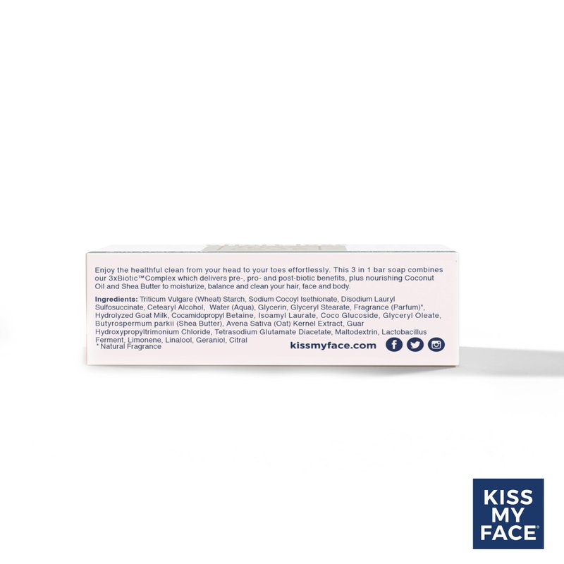 - VERSATILE 3-IN-1 FORMULA. Kiss My Face Effort-Less 3-in-1 Bar Soap is designed for hair, face, and body, combining the benefits of probiotics and shea butter for a comprehensive cleansing experience.