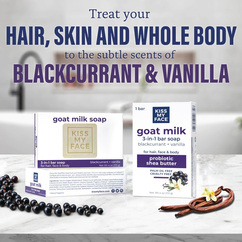 Kiss My Face Goat Milk 3-in-1 Bar Soap - Blackcurrant + Vanilla - Probiotic Bar Soap for Face, Hair, and Body with Shea Butter - Palm Oil-Free and Cruelty-Free Soap (Blackcurrant + Vanilla, Pack of 1)