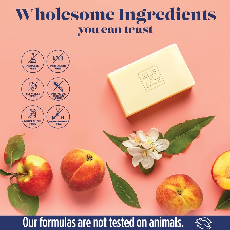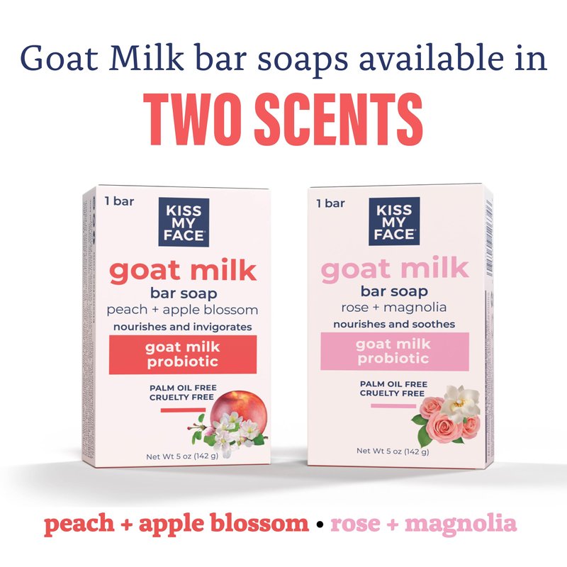 - SOOTHING & NOURISHING Formulated to soothe and nourish the skin, Kiss My Face Goat Milk Bar Soap provides a gentle cleanse while replenishing moisture and promoting a healthier-looking complexion. Enjoy the delightful and subtle scents of peach and apple blossom, elevating your bathing experience with a soothing and indulgent aroma.