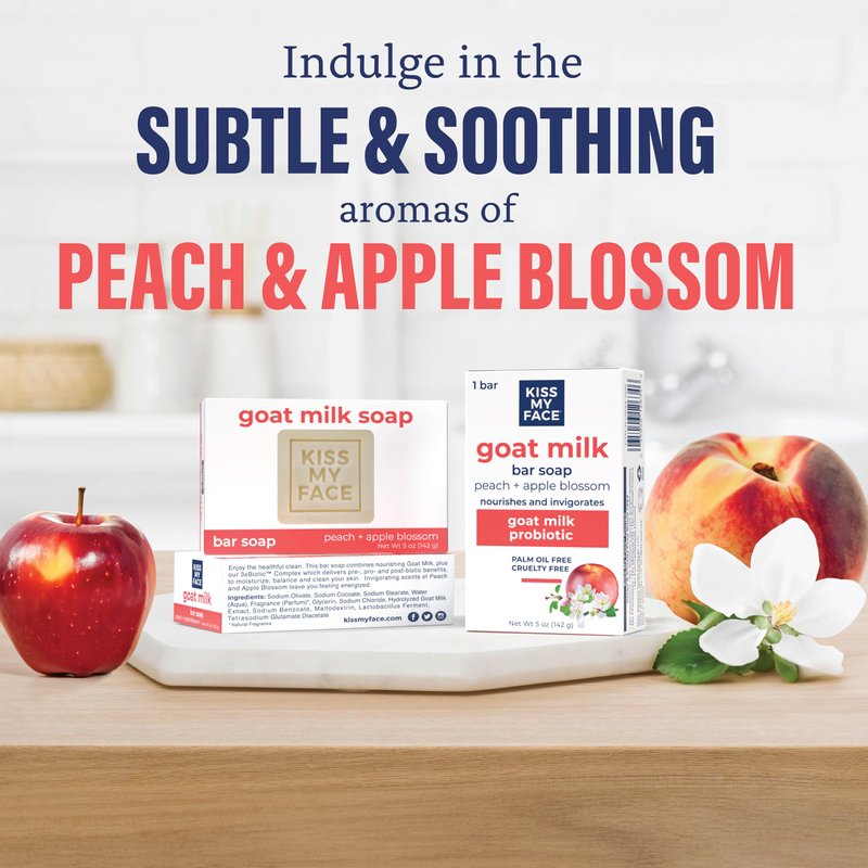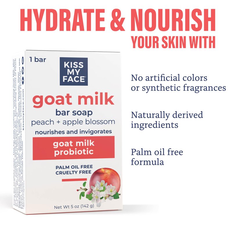 - GOAT MILK & PROBIOTICS INFUSION. Kiss My Face Goat Milk Bar Soap Peach & Apple Blossom harnesses the moisturizing power of goat milk and the skin-balancing benefits of probiotics, creating a potent blend that nurtures and supports skin health.