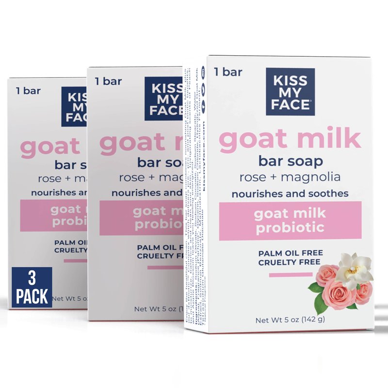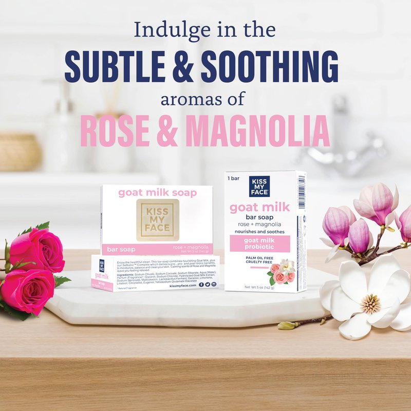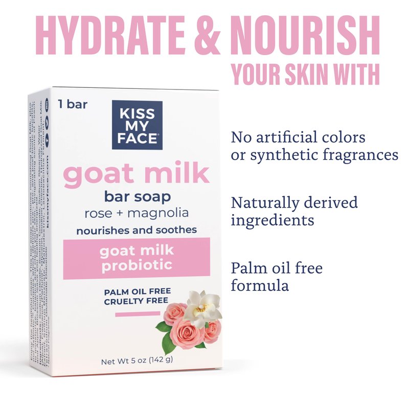 - GOAT MILK & PROBIOTICS INFUSION. Kiss My Face Goat Milk Bar Soap Rose & Magnolia harnesses the moisturizing power of goat milk and the skin-balancing benefits of probiotics, creating a potent blend that nurtures and supports skin health.