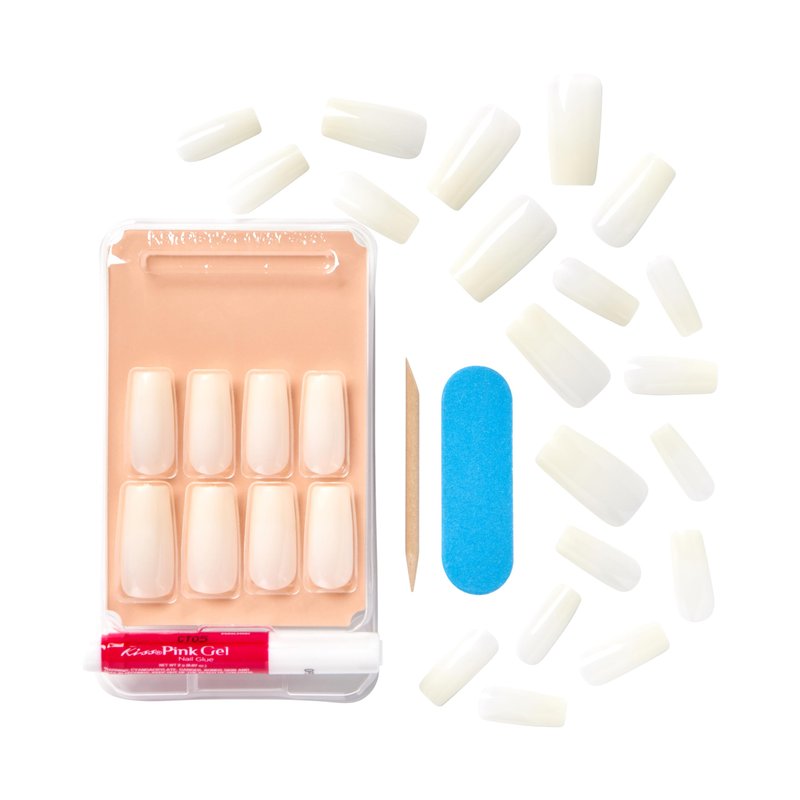 KISS Salon Acrylic Press On Nails, Nail glue included, Bareskinned', White, Long Size, Square Shape, Includes 28 Nails, 2g glue, 1 Manicure Stick, 1 Mini File