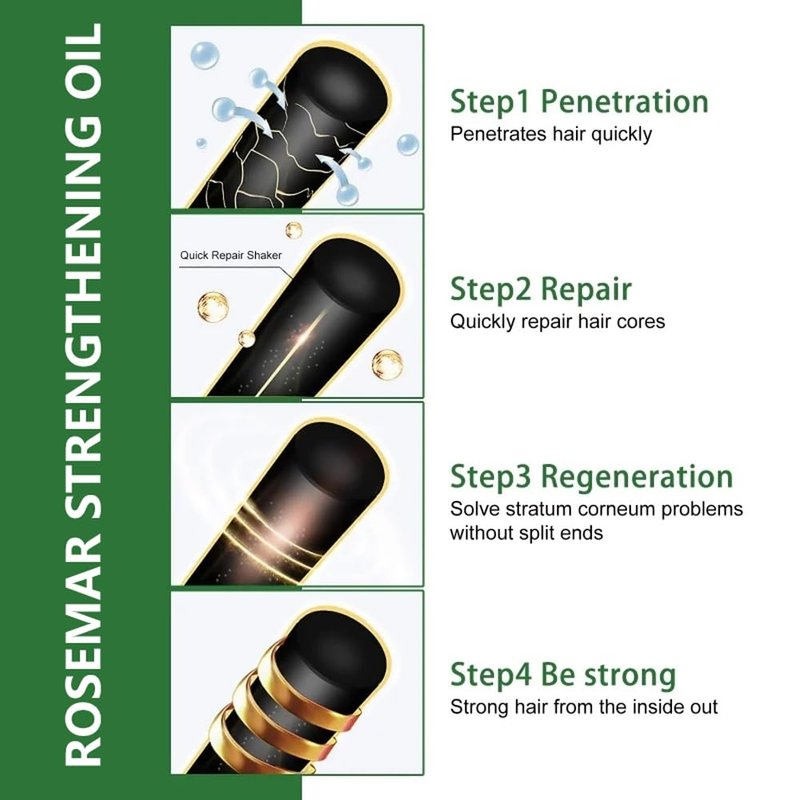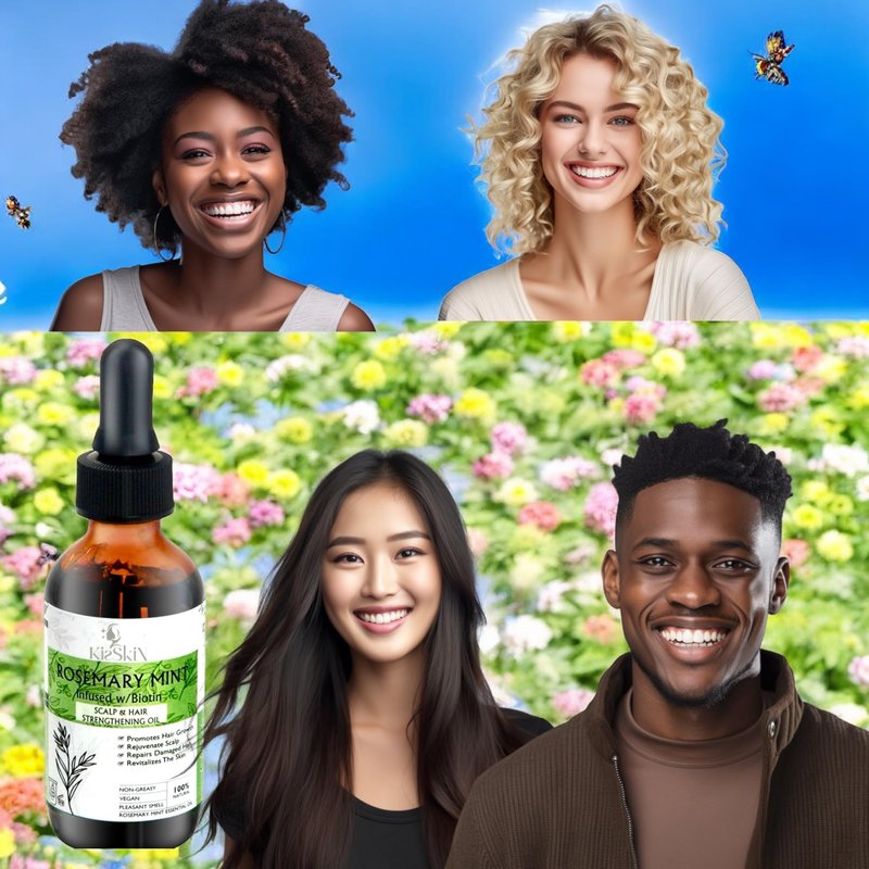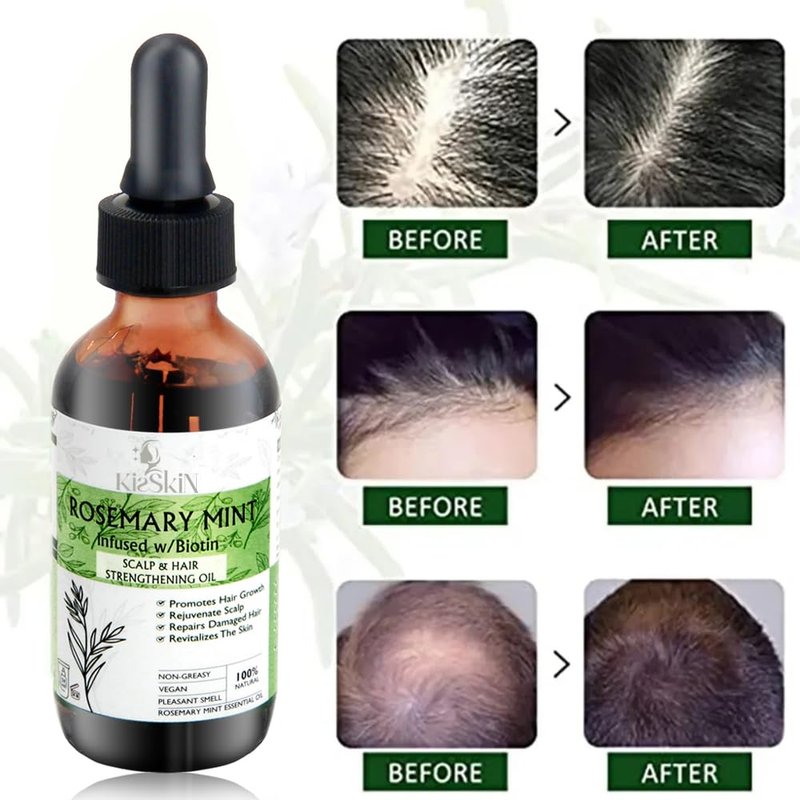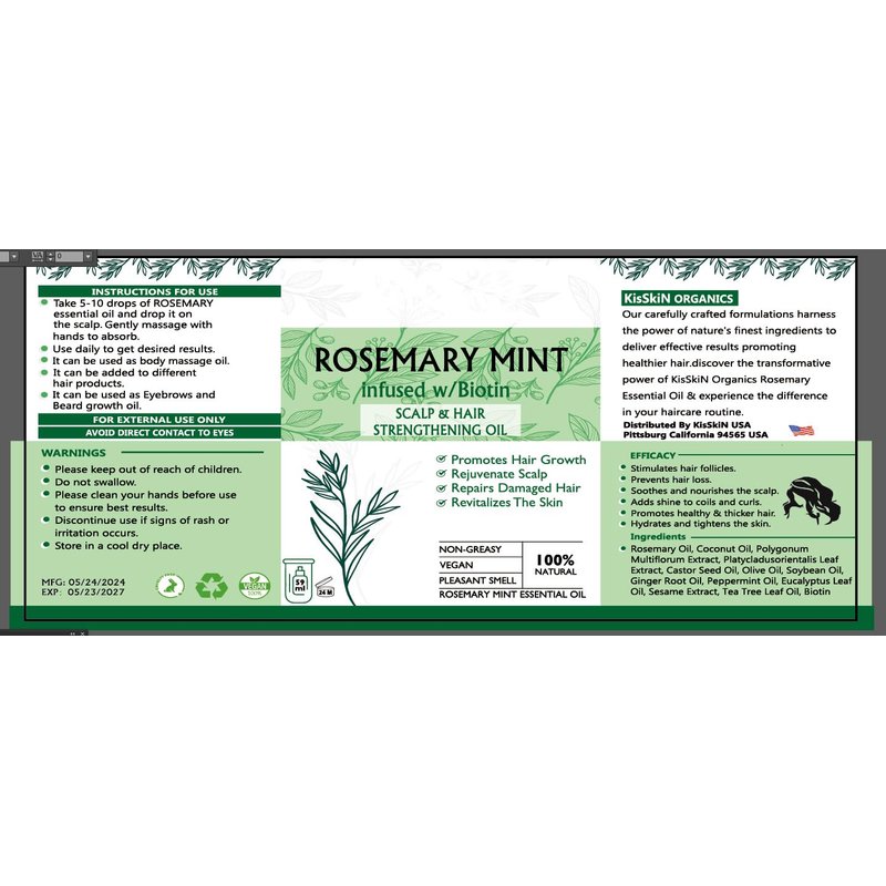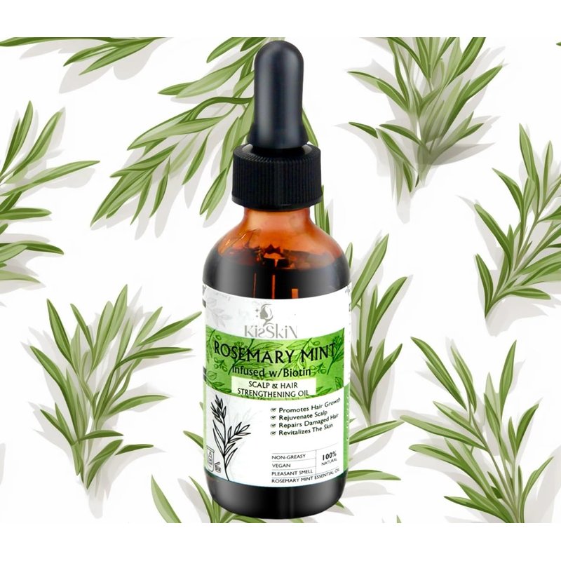 - . HAIR AND SCALP STRENGTHENING OIL : Kisskin Rosemary Mint Oil helps in hair and scalp strengthening stimulates hair folicles and prevent hair loss. .INGREDIENTS : Rosemary oil, Coconut oil, polygonum Multiforum Extract, Castor seed oil, Olive oil, Soybean oil, Ginger root oil, Peppermint oil, Eucalyptus leaf oil, Sesame extract, Tea tree leaf oil, Biotin.