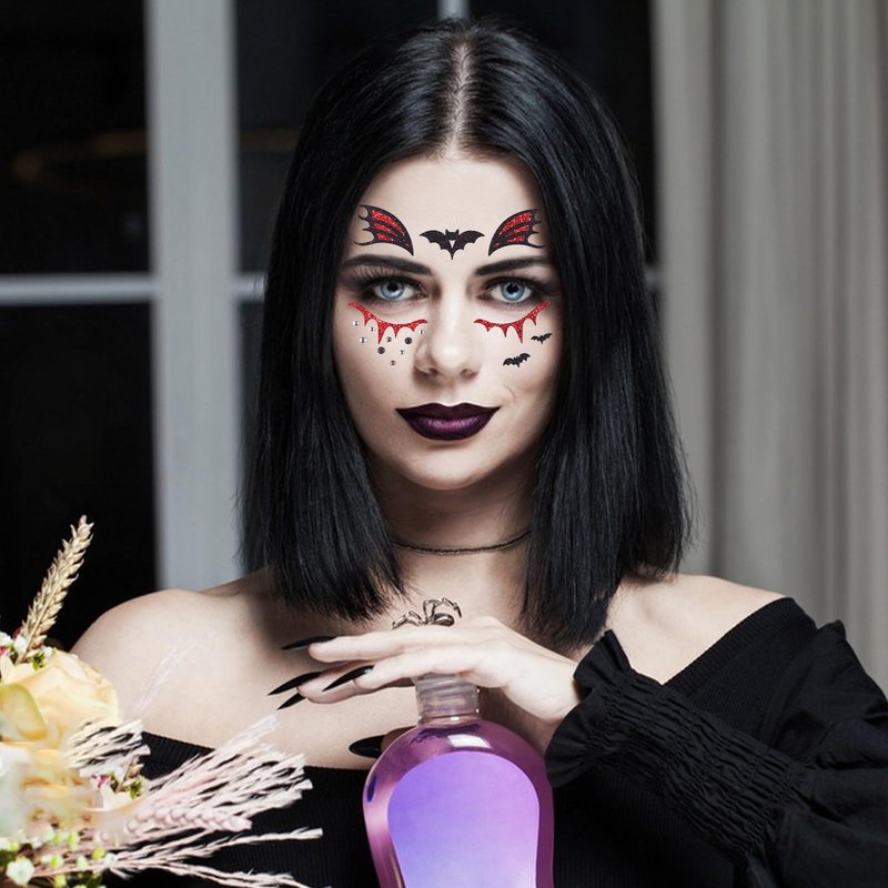 - Easy to Use: Glitter bat fake tattoos is very convenient to use. Just use tweezers to remove the sticker and place the Halloween face tattoo face up on clean skin. Gently press to reveal the beautiful tattoo