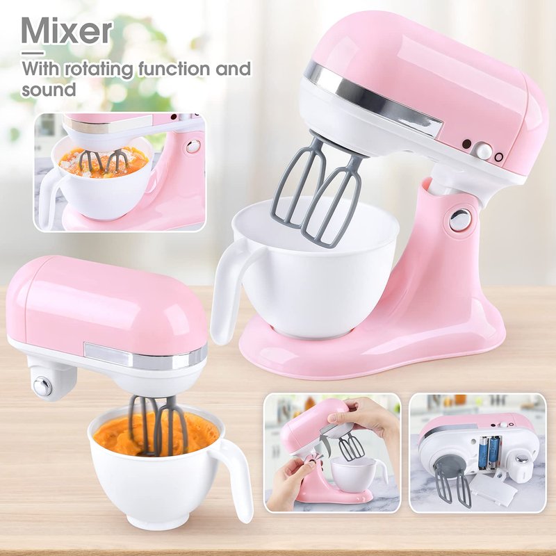 - Toy mixer that works:Rotatable mixer, which can be used to make real food. For example, you can instruct your child to add eggs, flour and milk into the blender to make delicious cookies. Turn the mixer switch to the black circle and the mixer can start working.