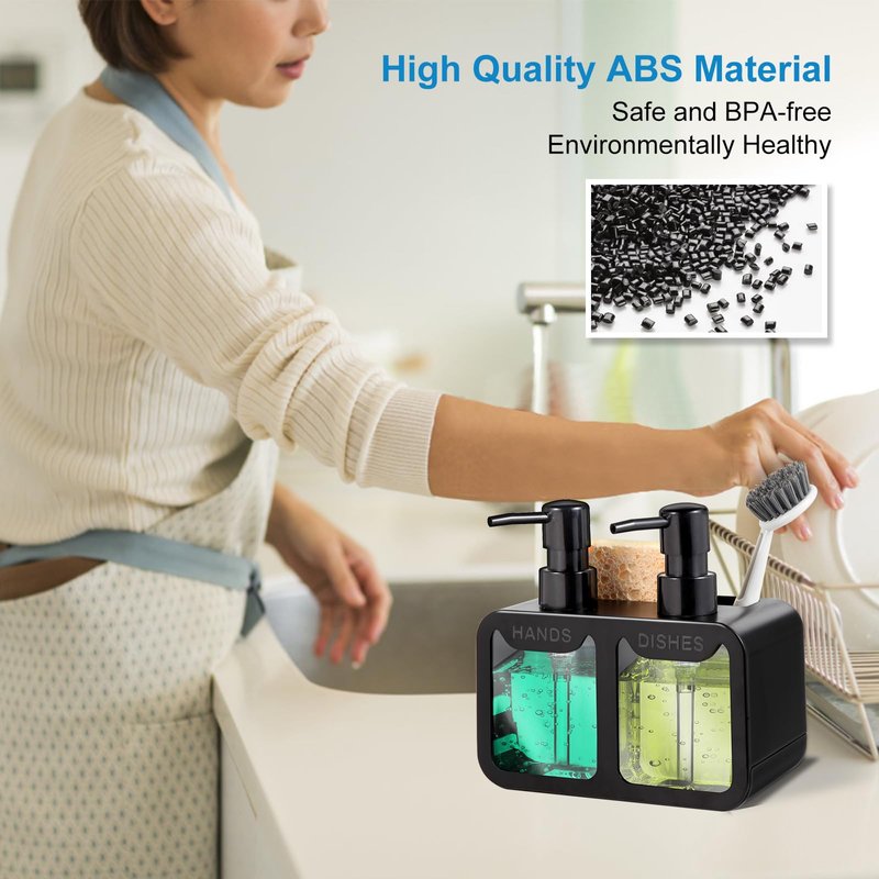 - Versatile 4-in-1 Design: This dish and hand soap dispenser set comes equipped with two separate transparent soap bottles, allowing you to conveniently store hand soap and dishwashing liquid simultaneously. It also includes a sponge tray and brush holder, making it easy for you to organize cleaning supplies. This clever design not only enhances kitchen cleaning efficiency but also saves countertop space.