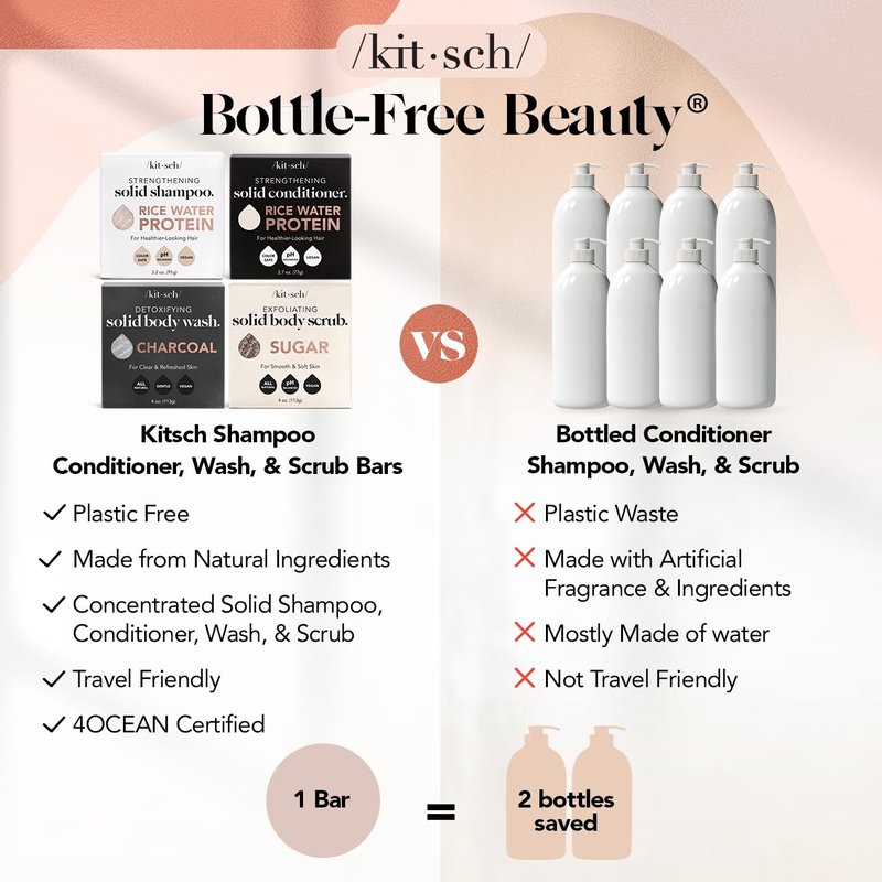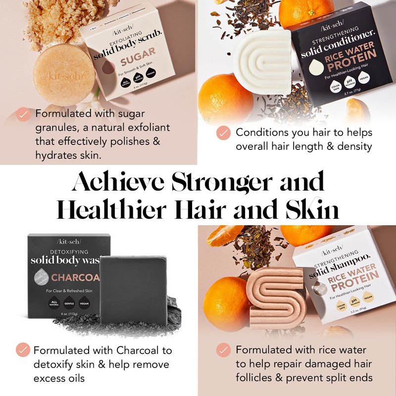 Introducing Kitsch's Hair & Body Care Essentials: Kitsch Rice Shampoo & Conditioner Bar: Experience the transformative power of our rice-infused shampoo and conditioner bars. Enriched with rice water secrets, they helps hair growth and vitality while gently cleansing, moisturizing, and nourishing your hair. Our paraben-free and sulfate-free formula helps excessive splitting and breakage, offering a luxurious salon-quality experience without the guilt of plastic waste. Made with natural ingredients, pH-balanced, and 100% compostable, our bars are a sustainable choice for healthy, eco-friendly hair care. Kitsch Charcoal Soap Body Wash Bar: Formulated with charcoal to help detoxify skin and help remove excess oils, our soap bar creates a mild, gentle lather to cleanse and reinvigorate your skin without stripping or drying it out. Ideal for daily cleansing, especially as an underarm bar, it's free of parabens, phthalates, silicones, sulfates, and artificial fragrance. Made in the USA,it helps clear pores, gentle on all skin types, and tightens and firms for a radiant complexion. Kitsch Sugar Body Scrub Bar: Indulge in the ultimate exfoliating experience with our sugar scrub bar. Formulated with sugar granules and walnut shell, it effectively polishes and hydrates your skin, leaving it softer and smoother. Featuring a warm, sweet sugar scent, our scrub bar is free of parabens, phthalates, silicones, sulfates, and artificial fragrance. Made in the USA, it exfoliates, provides more moisture, fights ingrown hair, and improves your skin's glow. Elevate your self-care routine with Kitsch's Hair & Body Care Essentials – experience the magic of natural ingredients and sustainable beauty today!