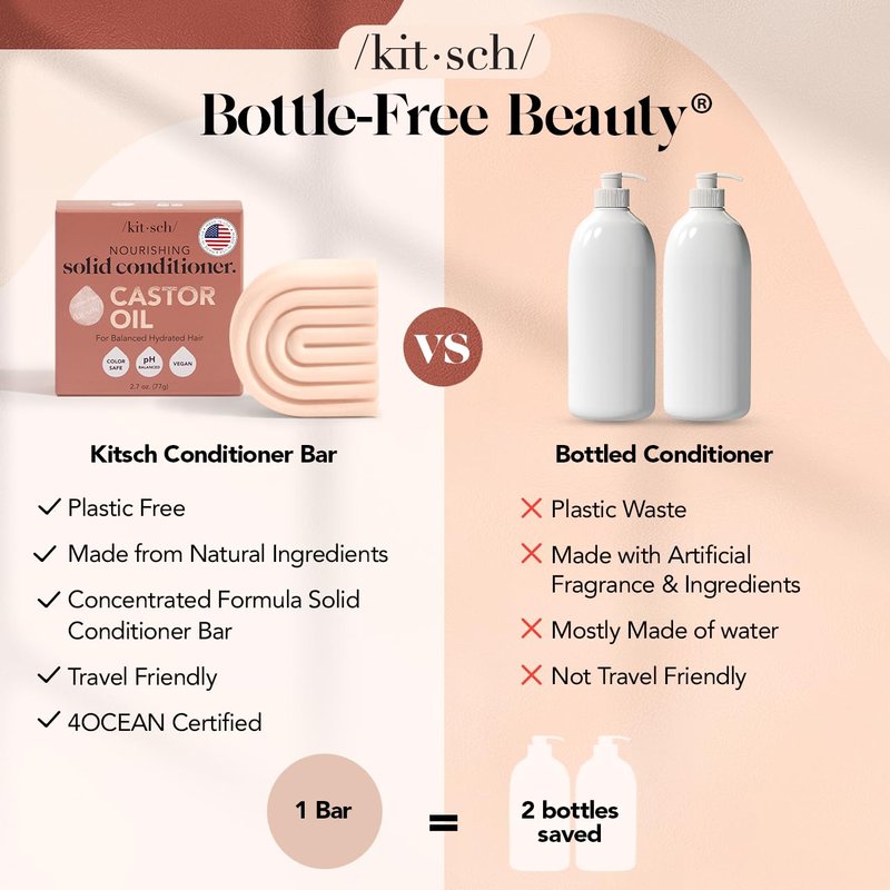 - LONG-LASTING, ECO-FRIENDLY & TRAVEL READY: Kitsch Castor Oil Bar Conditioner offers a long-lasting, concentrated formula that lasts about as long as two bottles of liquid conditioner, providing excellent value for money and reducing the frequency of repurchases.Packaged in zero-waste, recycled paper materials, this compact bar conditioner is perfect for travel, fitting easily into any bag without risk of spills, and comes with a convenient storage tin to keep it dry and intact.