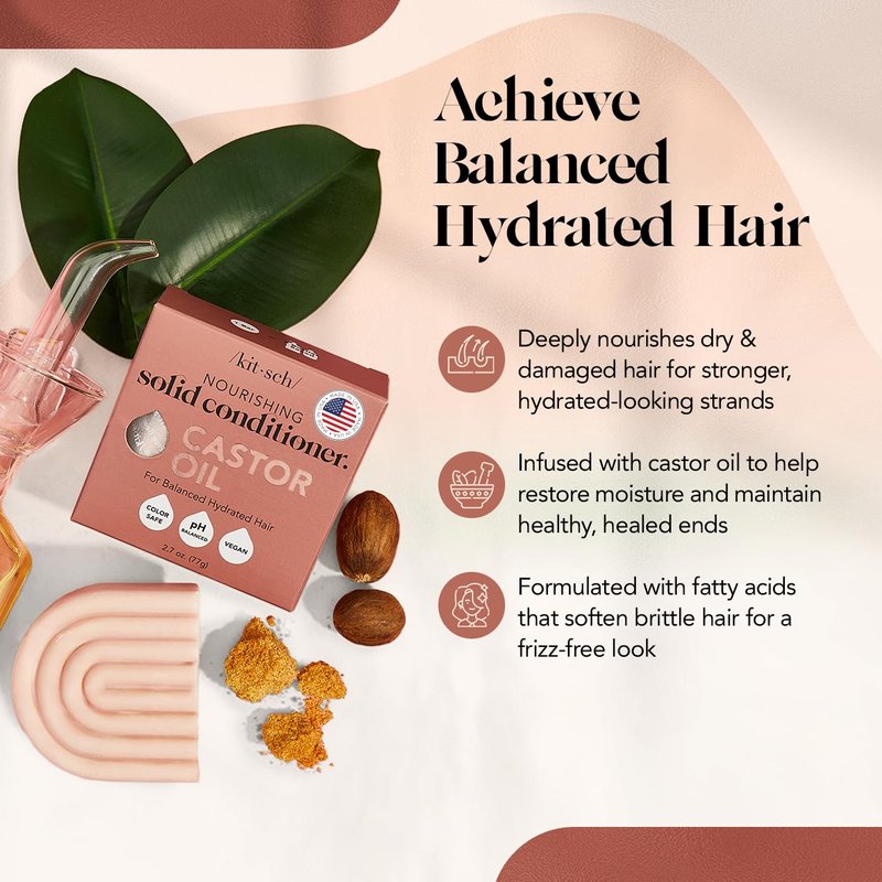 - GENTLE & SAFE FOR SENSITIVE SCALPS: Made with gentle, hypoallergenic ingredients, this Kitsch castor oil organic conditioner bar is suitable for sensitive scalps and skin, ensuring a pleasant, irritation-free experience. Free of parabens, phthalates, silicones, sulfates, and artificial fragrance, it’s also pH balanced and safe for color-treated hair.