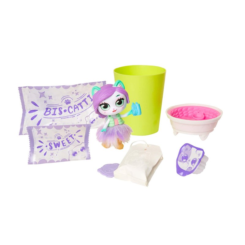 - Mystery Biscatti bag contains adorable, cat-inspired doll with 5 points of articulation and molded, removable hair style