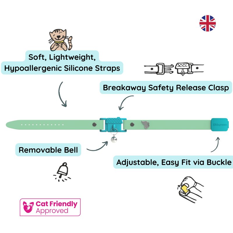 What makes Kittyrama cat collars the best in the land? Unbeatable comfort: Our Silicon straps are so soft, smooth and lightweight, cats forget they have their cat collars on (except when they become the envy of all the other cats in the neighbourhood.) Hypoallergenic, Breathable, Waterproof: Unlike fabric and leather cat collars, our hypoallergenic straps help to protect the neck area from moisture and heat, for less chances of irritation. Ultra safe: Featuring quick release break away clasps, designed to open if a cat finds themselves caught in an adventure (the break away clasps open as cats pull with their bodies to free themselves). Perfect fit: Tailor the fitting to your cat’s neck via the buckle with holes. Our patented design won’t let the fitting move with wear, ensuring comfort and safety every day. Recommended by Vets and welfare experts: Kittyrama collars are the only cat collars to receive a 'Cat Friendly' award by International Cat Care, the global charity for the welfare of cats. We are the cats that got the cream! Kitten size or Adult size? Kittens and adult cats have very different physiques and strength, and for safety and comfort require different cat collar sizes and break away clasps! Our Kitten collars fit neck sizes between 5.7 inch and 7.3 inch Our Adult cat collars fit neck sizes between 7.7 inch - 10.4 inch Please measure your cat's neck before purchase to ensure a safe fitting can be achieved. Super Stylish: As seen in Vogue magazine. We are so confident your cat will rock them so much, we are sorry in advance for any increase in cattitude.