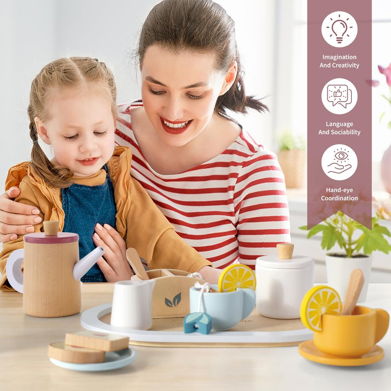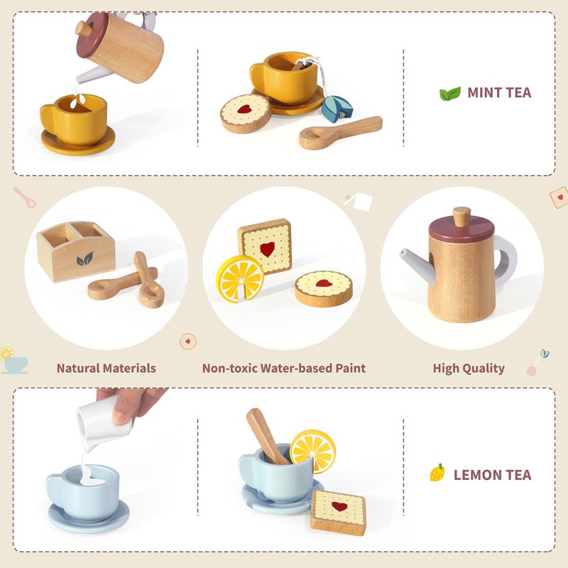 - Tea Time Play: Add in milk or sugar to create the perfect cup of tea, and serve your guests delightful cookies. The natural look and fun open play of wooden tea sets align with your child's interests and developmental stage