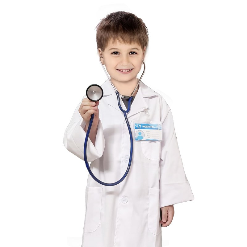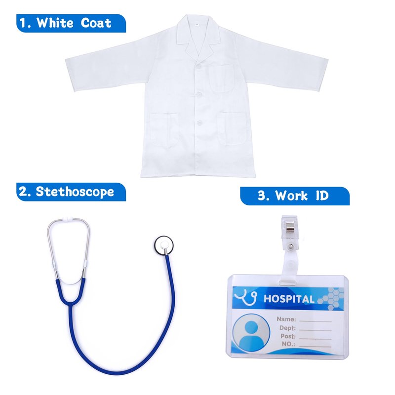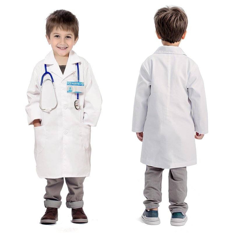 - DOCTOR COSTUME FOR TODDLERS KIDS - Kizzyland doctor role play costume set including a white doctor lab coat, work ID Card and a real working stethoscope. The white coat is made of high quality polyester fabric, which is soft, skin-friendly, and comfortable. Our doctor play set will bring your kids a real and fun experience of dress up as a little doctor.