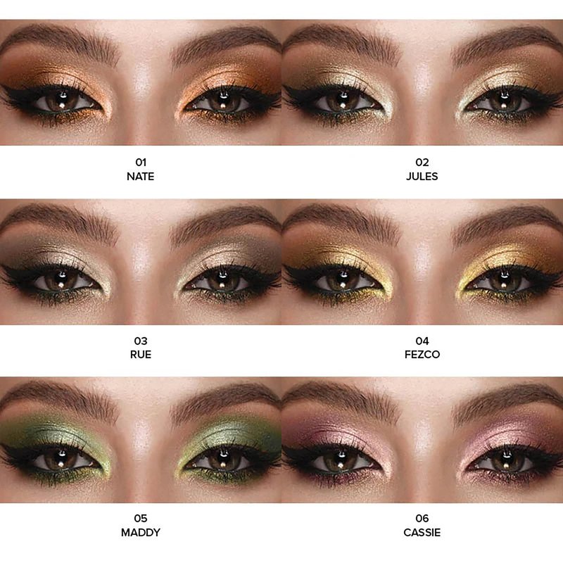 - SIX SHADES COLLECTION. Discover six captivating shades in our glitter eyeshadow set, including brown eyeshadow, pink eyeshadow, green eyeshadow, nude eyeshadow, orange eyeshadow, and yellow eyeshadow. Each shade delivers a unique finish.