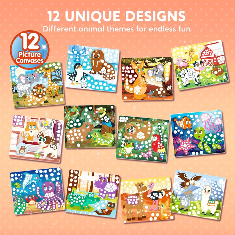 - Comprehensive Crafting Kit: Immerse yourself in exploring 12 pictures across 6 double-sided canvases with over 1180+ solid dot stickers, 130+ graphic dot stickers, and 160+ foil dot stickers.This abundance of materials provides endless opportunities for imaginative play and exploration.