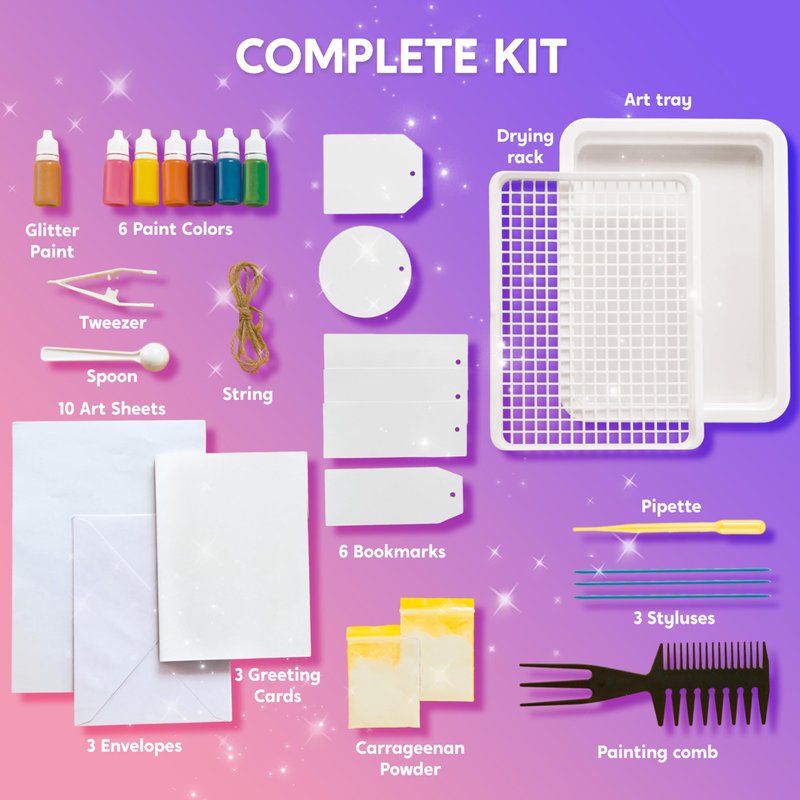 - ALL-IN-ONE Crafting Set: Everything you need to get started is included in this kit, from the design tray with a drying rack to 6 vibrant paint colors, 1 gold metallic paint, and an assortment of tools including a painting comb, styluses, pipettes, and spreaders. Plus, you'll get 10 art sheets, 3 blank greeting cards, 3 envelopes, and 6 blank bookmarks, offering endless artistic possibilities.