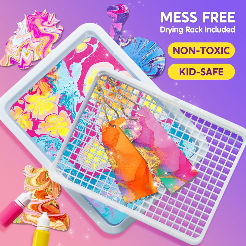- Mess-free with Drying Rack: Our kit includes a perfectly sized drying rack that matches the art tray, effectively containing paint drips and promoting efficient drying of your marbled creations. Enjoy the convenience of hassle-free drying by simply placing your artwork on the rack and maintaining a tidy workspace.