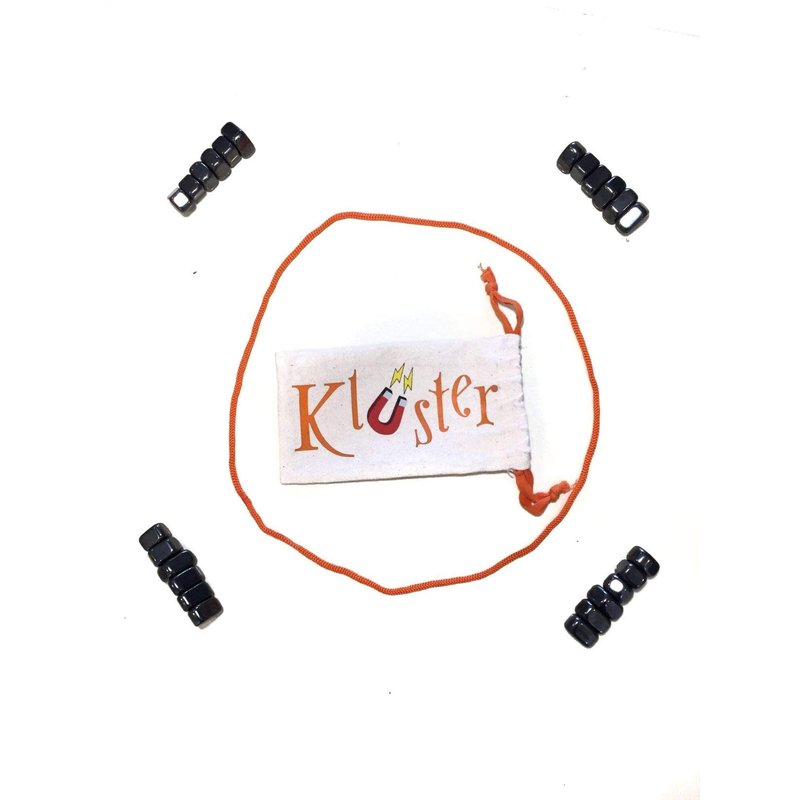 - Kluster consists of 24 hematite magnets, a travel bag, and a lanyard.