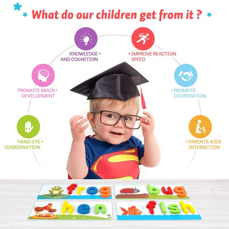 - High Quality Material: Smooth edge and surface of wood block, and color of the surface is made of environmentally friendly paint. Absolutely safety for children.Larger-size wooden blocks can prevent the risk of suffocation of children. Parents can rest assured that children complete the entire game system independently. They can easily build their confidence,includes improve children's letter recognition, spelling, word formation, and help early vocabulary recognition accumulation.