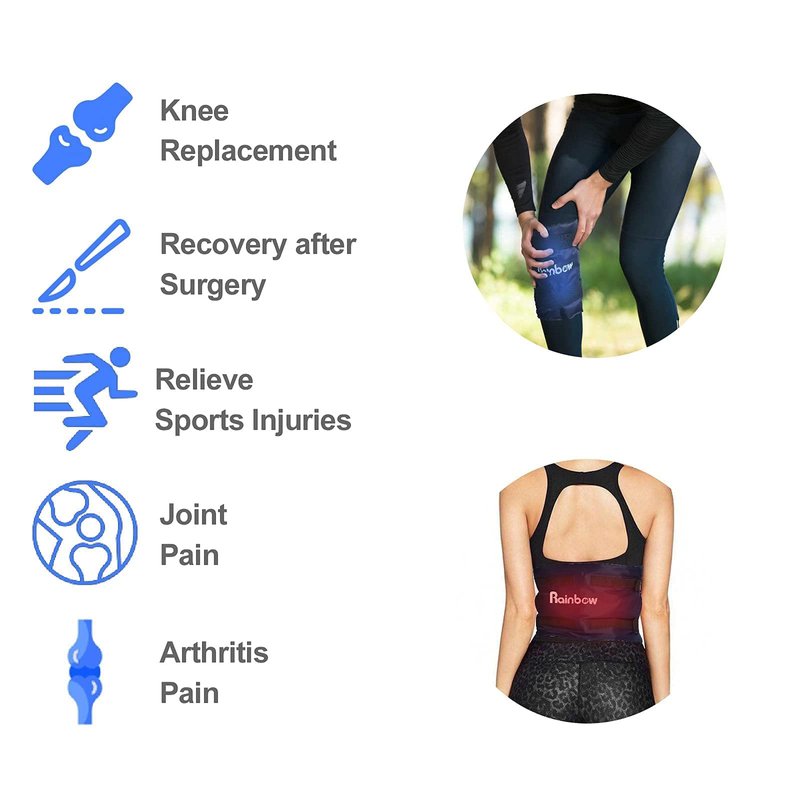 Knee ice wrap size :21.7" x 9.8", Knee gel ice pack weight: 800g;With 2 detachable straps. RAINBOW is a production and processing company that takes pride in professional hot and cold therapy products and customer service. Please feel free to contact us if you have any issues, we will gladly answer any of your questions. Comfortable knee hot and cold compress ice pack, please choose RAINBOW ice pack for knee injuries, large knee cold pack.