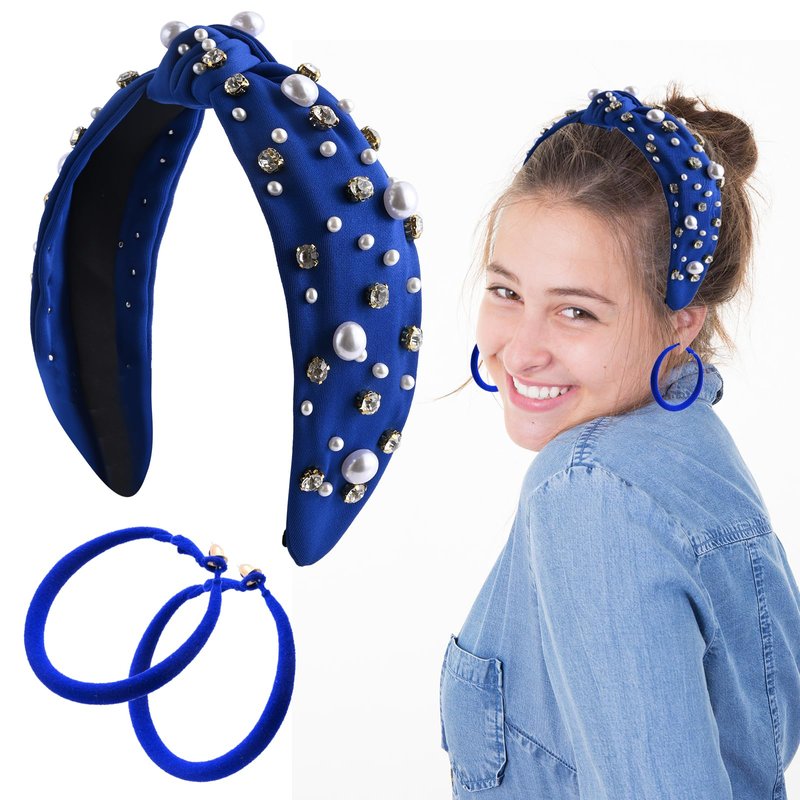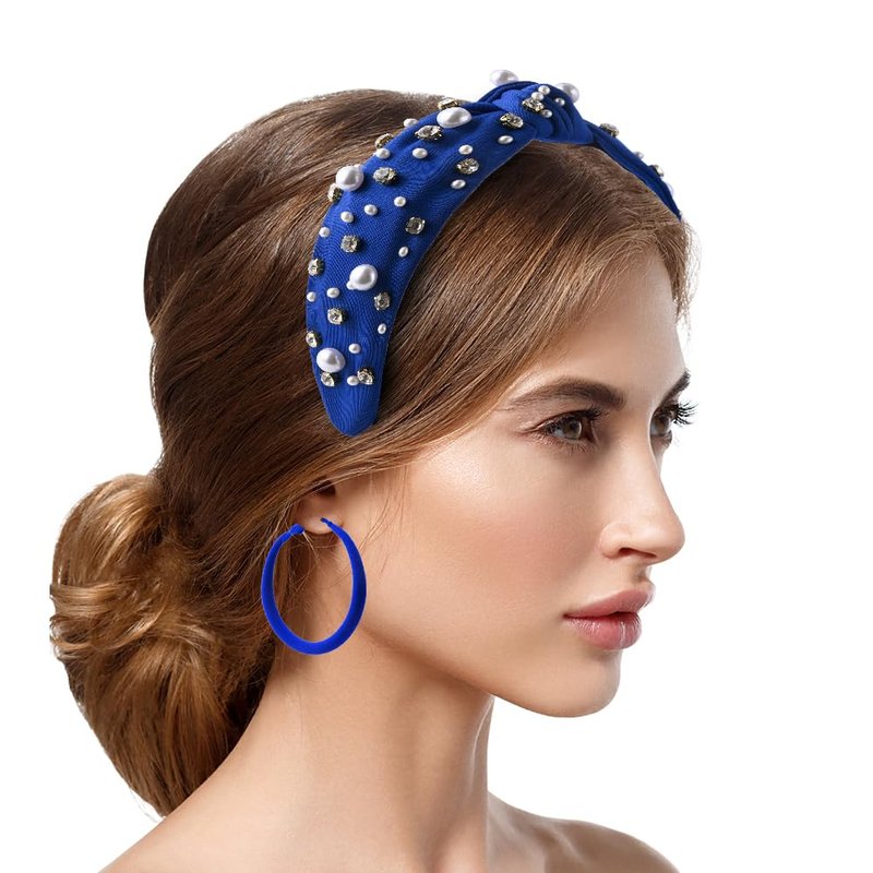 Knotted Jeweled Headband with Big Hoop Earrings, Pearl Rhinestone Jeweled Knotted Headband, Football Headband Fashion Elegant Ladies Wide Top Knot Bride Headband Bachelorette Party Hair Accessories