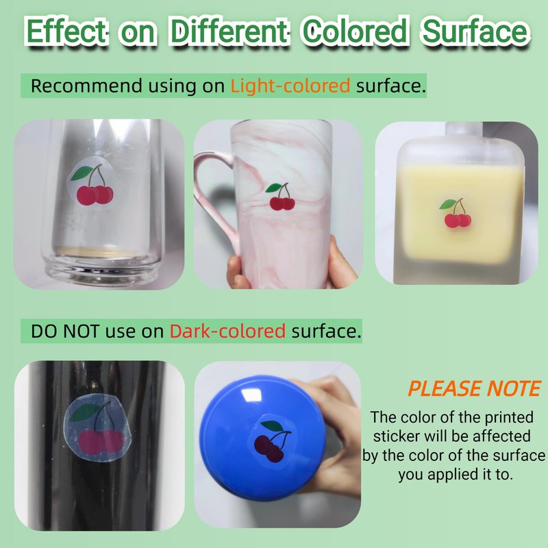 - Nearly 100% Transparent(Please note: It is common that all the inkjet clear sticker paper in the market has a slight white hue because of the ink absorption coating)
