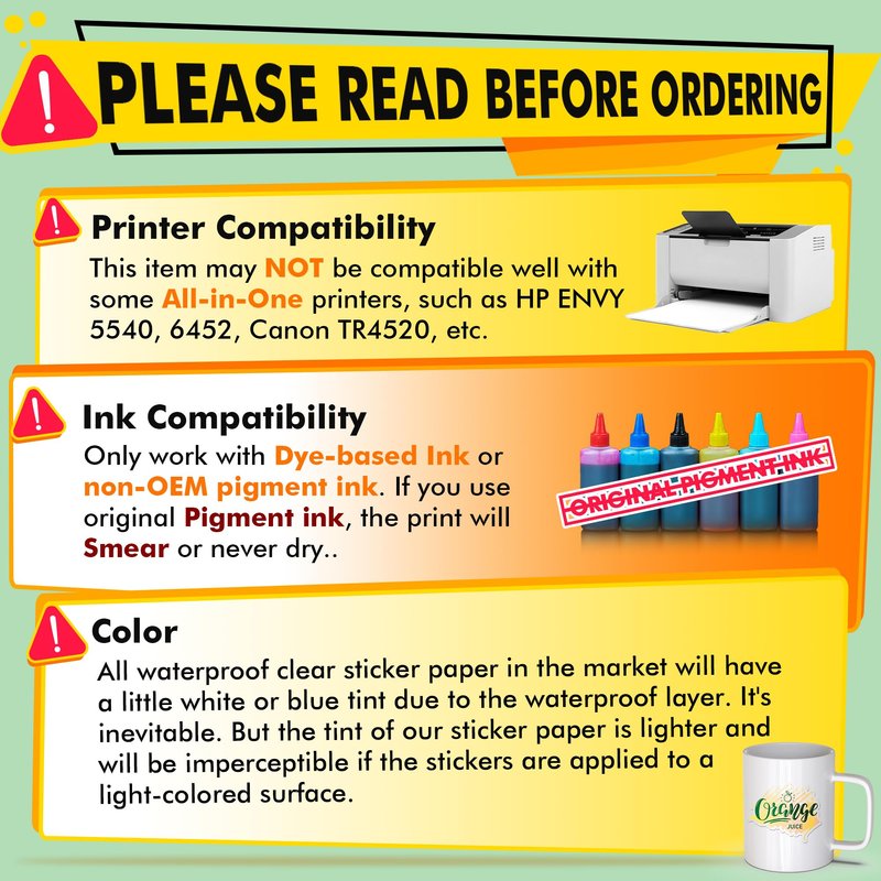 - Excellent Printing Results: Our clear printable sticker paper can hold ink beautifully, resulting in vibrant and crisp prints. The ink dries quickly in a few minutes. NOTE: MUST USE DYE INK.